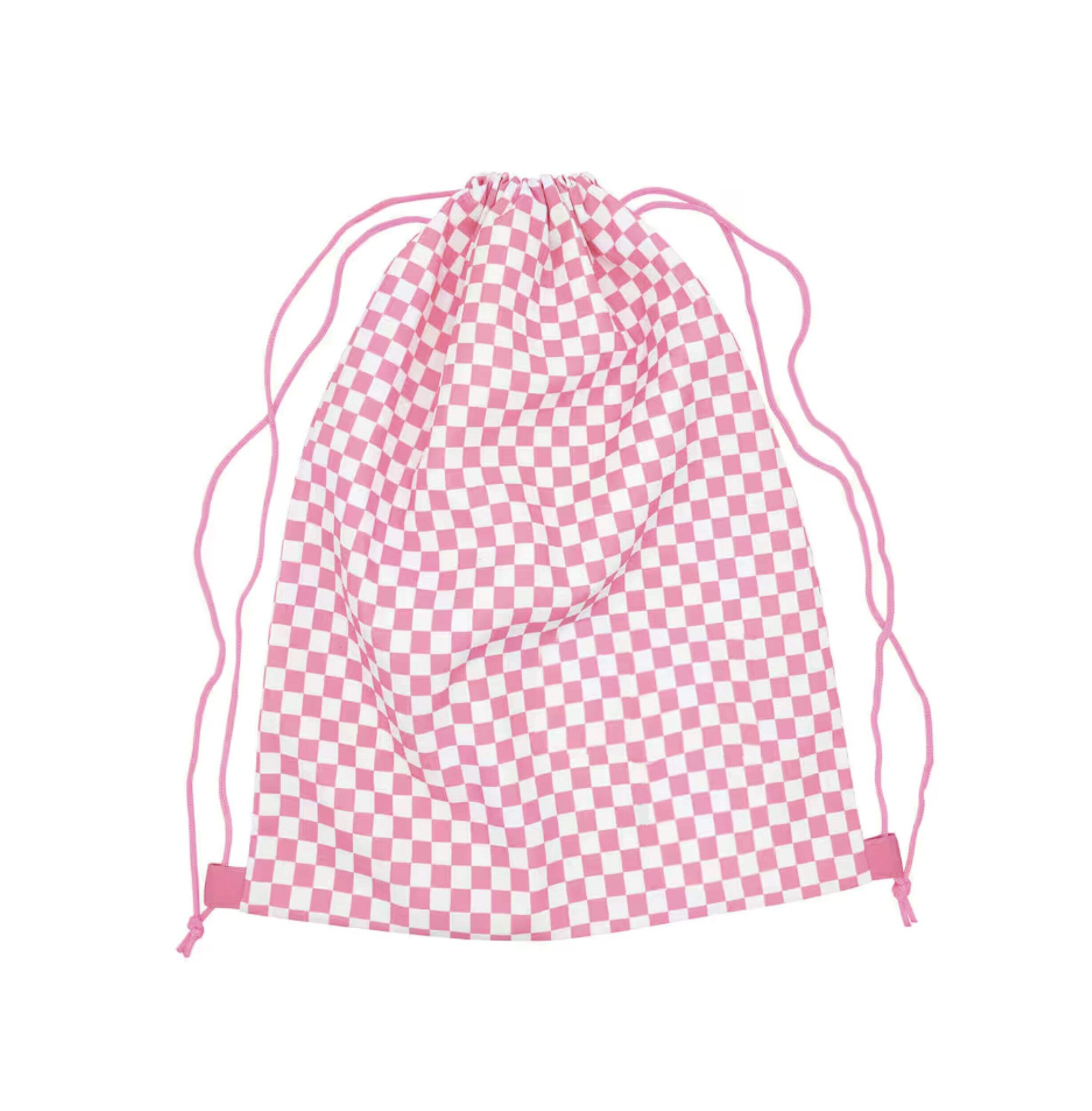 Drawstring bag with a pink and white checkered print