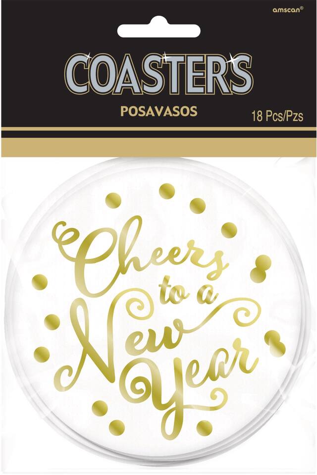 Round cardboard coasters feature gold polka dots and a "Cheers to a New Year" headline on a white background