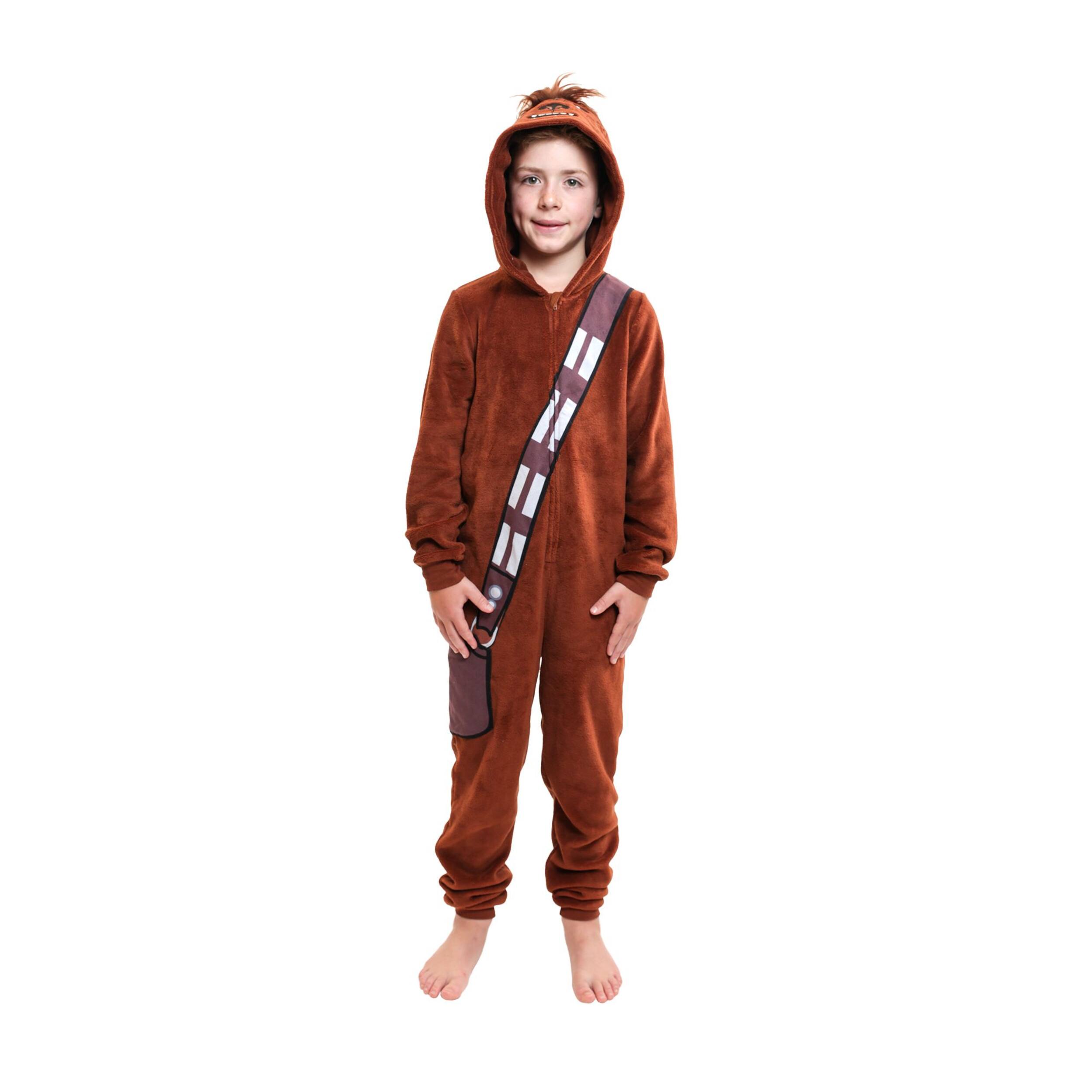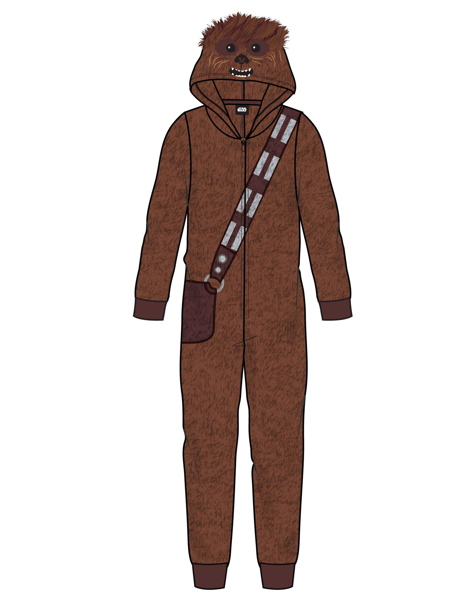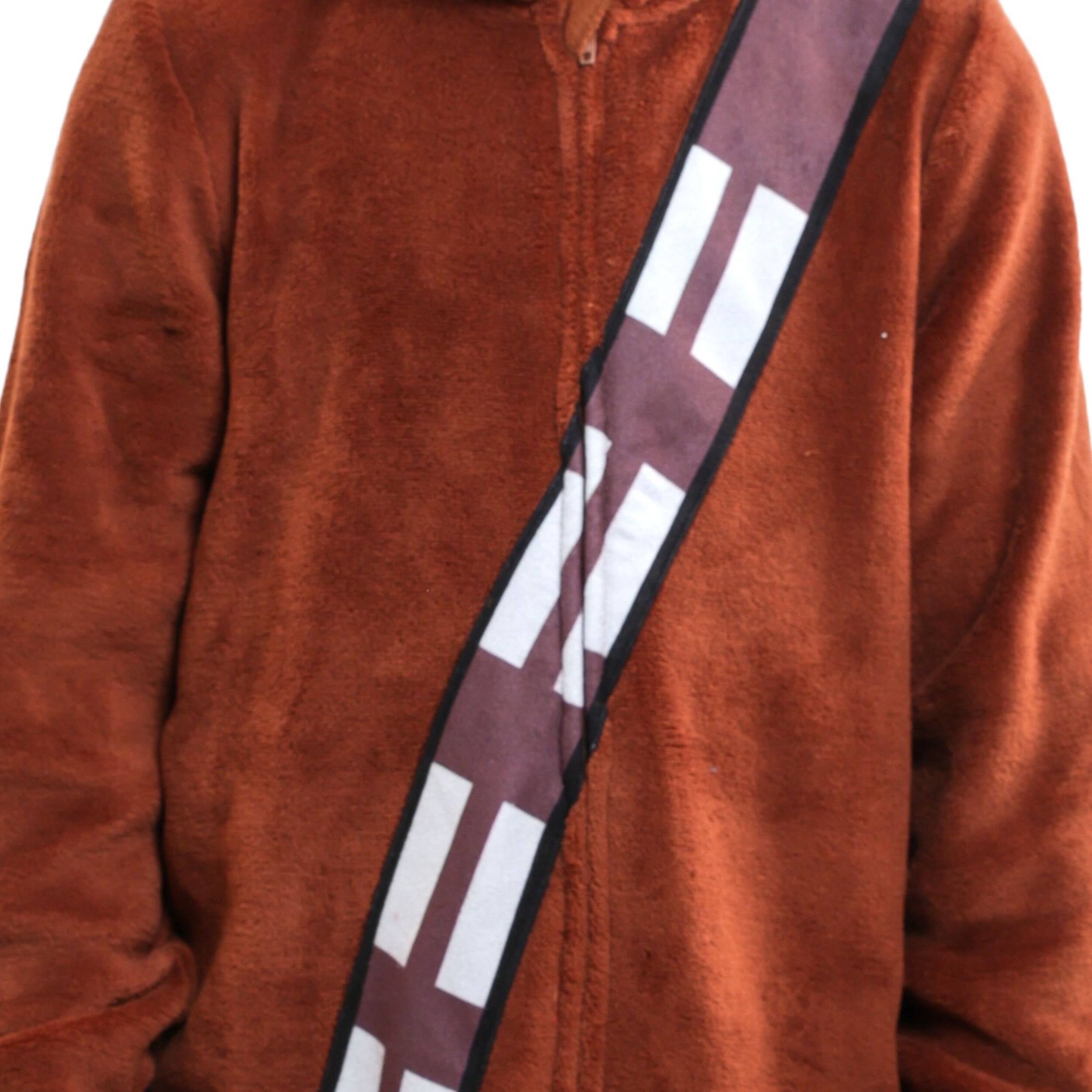 This onesie features a brown jumpsuit with a side bag printed on and a happy Chewbacca face on the hood