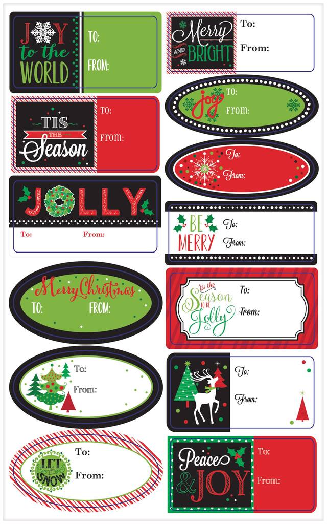 • Christmas Adhesive Gift Tags feature a bold chalkboard style with a red, green, and black colour palette
