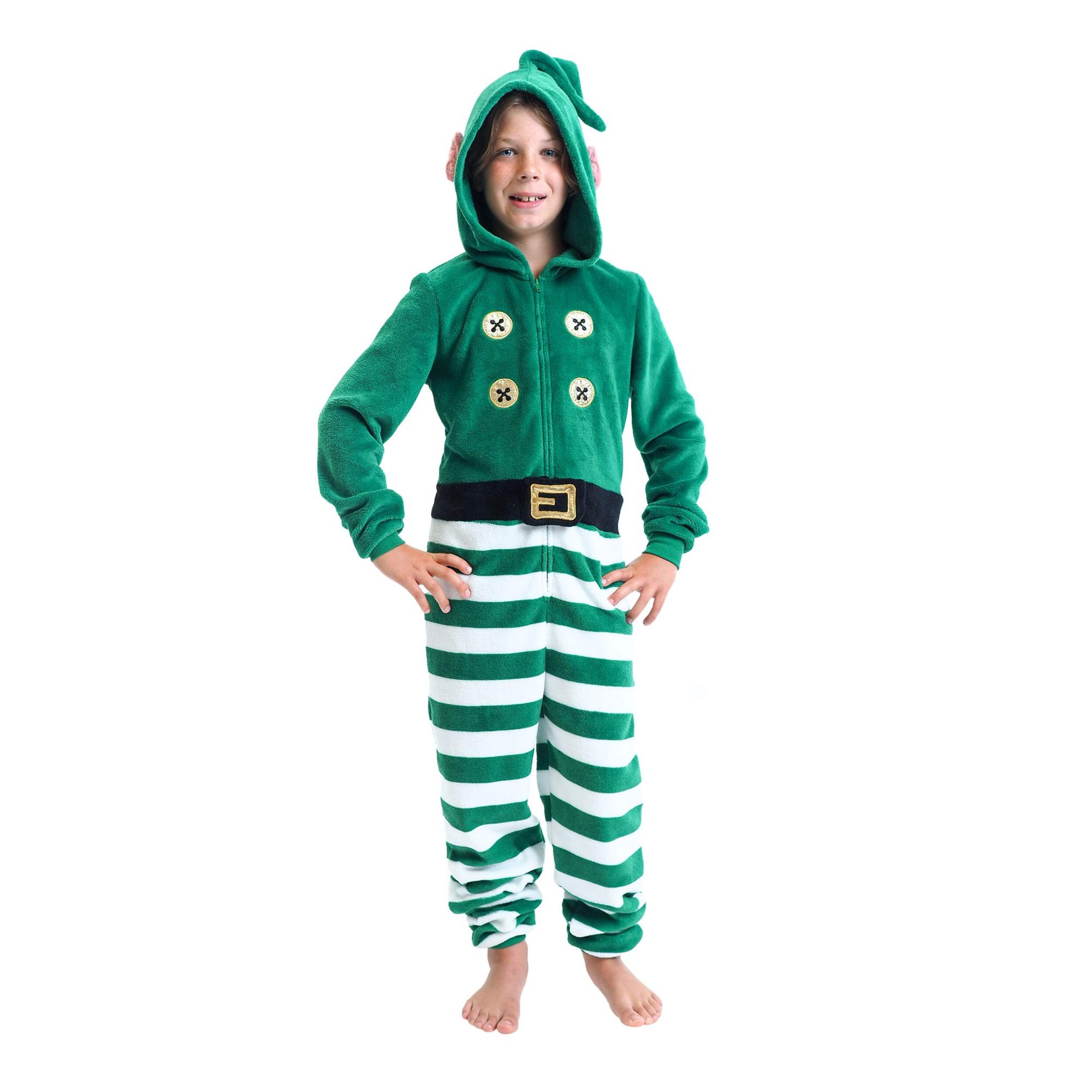 This onesie is green and white stripped with a black belt and 3D elf ears attached to the hood