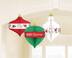 Hanging holiday decorations are shaped like ornaments in green, red and white