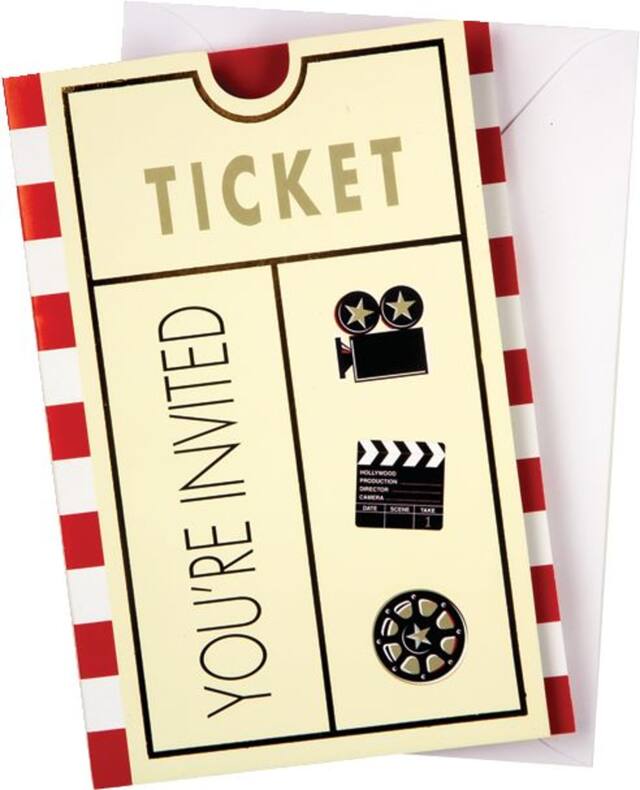 • Shaped like oversized movie tickets, these fun invitations feature movie-themed graphics with a "You're Invited" message