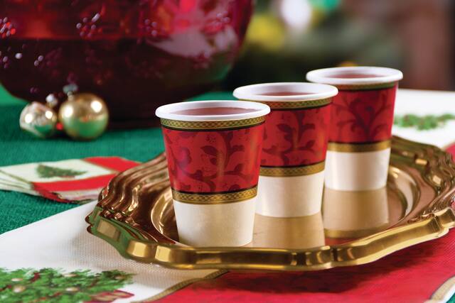 Ideal for a Christmas feast with all the trimmings these printed paper plates feature a vintage Christmas tree print a rich crimson hue and metallic gold trim