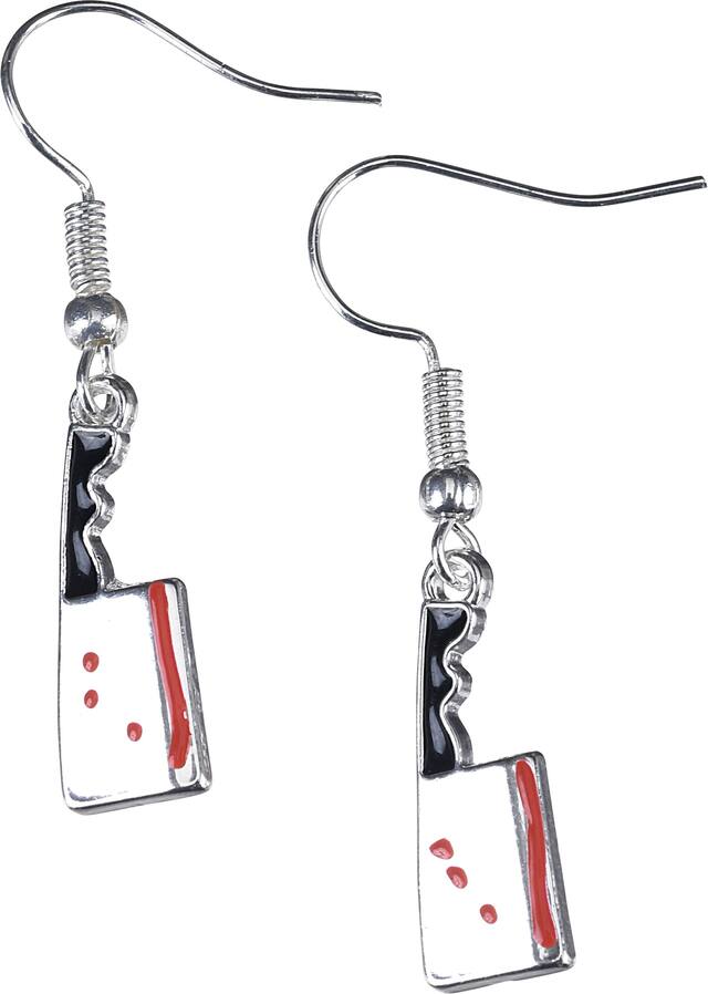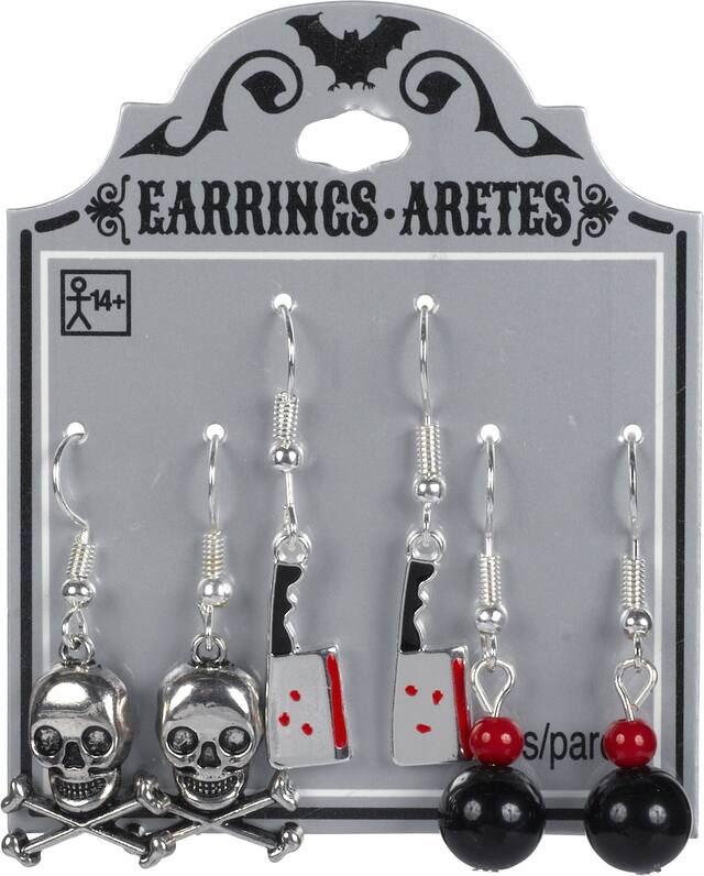 Includes (2) skull and crossbones earrings,(2) bloody cleaver earrings, and (2) black beaded earrings