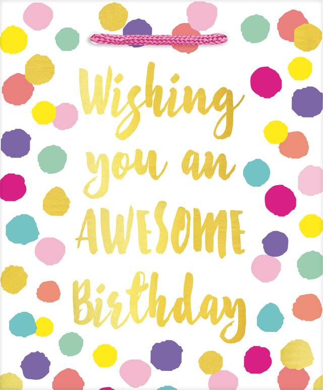 Paper gift bag features a gold "Wishing You An Awesome Birthday" headline in the middle surrounded by colourful dots