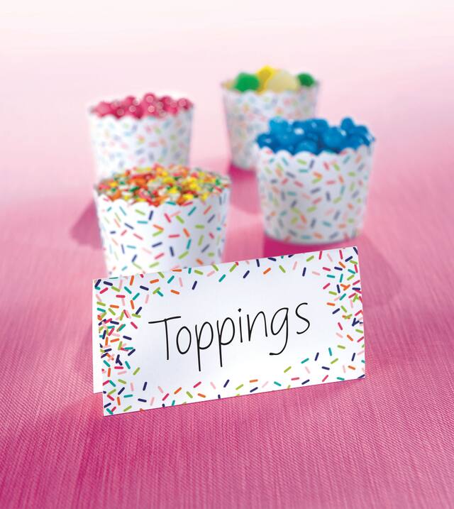 You may be interested in these similar products shown below.Colourful Sprinkles Tent Cards feature colourful sprinkles printed on a white background