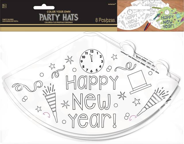 Each cone-shaped hat comes with a blank Happy New Year design for kids to customise however they want