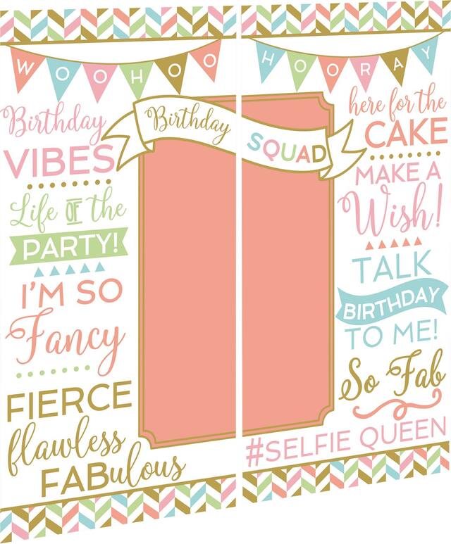Birthday posters feature pastel-coloured phrases like "Birthday Vibes," Birthday Squad," "Make A Wish," and "So Fab," plus so much more on a white background with pennant flag and herringbone printed designs
