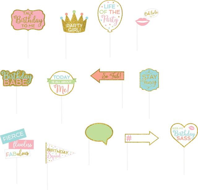 This confetti-themed birthday scene setter helps you create a fun photo booth area with its pastel colored phrases and punny sayings like "Birthday Vibes" and "So Fab" printed on the posters and banner. Snag some selfies and group pics with the included heart, crown and arrow shaped props while the 65 inch by 75 inch scene setter provides an Instagrammable backdrop bright enough to make any birthday shine.