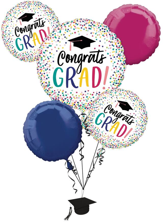 Center is a giant white balloon with the headline, Congrats Grad! surrounded by a colourful confetti pattern
