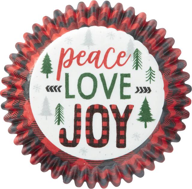 Feature black, brown and red plaid with the headline "Peace Love Joy" on the bottom