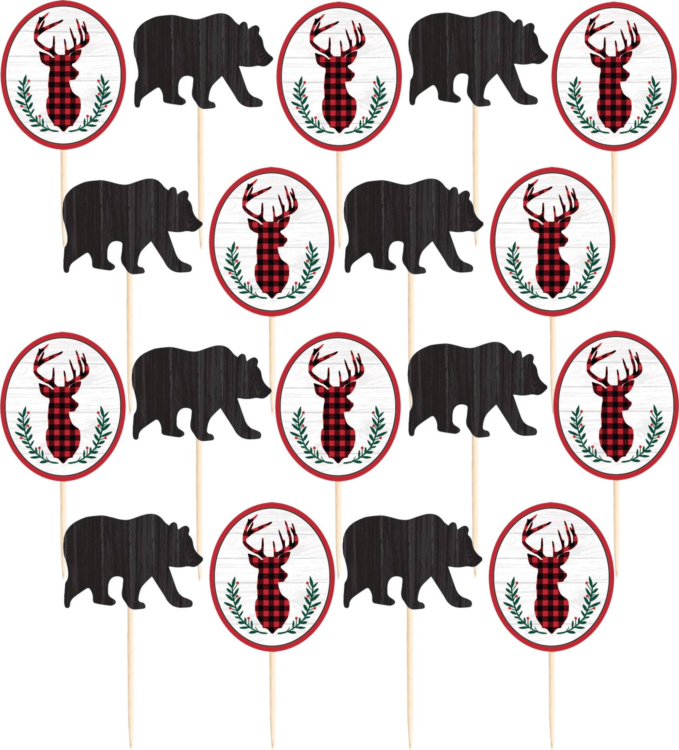Feature silhouettes of bears and deer in buffalo plaid and wood grain patterns