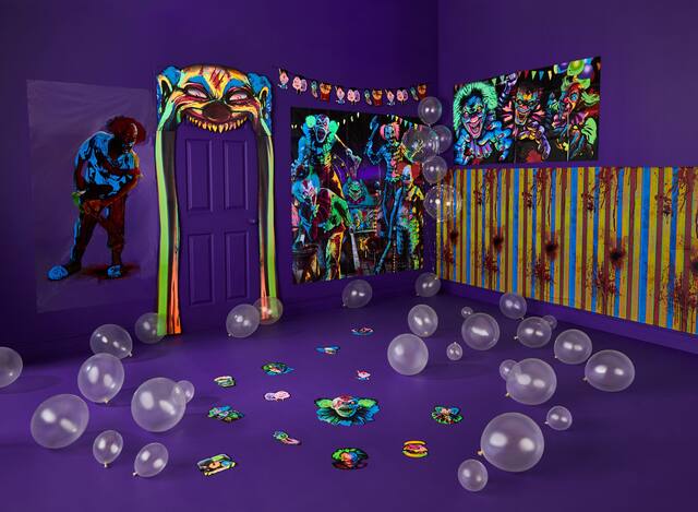 Creepy Carnival Deluxe Doorway Entry Blacklight is designed with a scary giant clown style