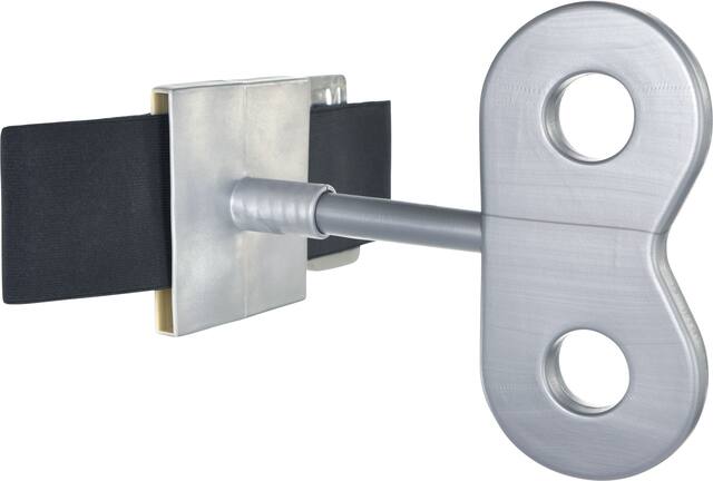 This doll costume accessory features a black stretchable belt with a metal slide-in buckle and a grey, plastic wind-up key on the back