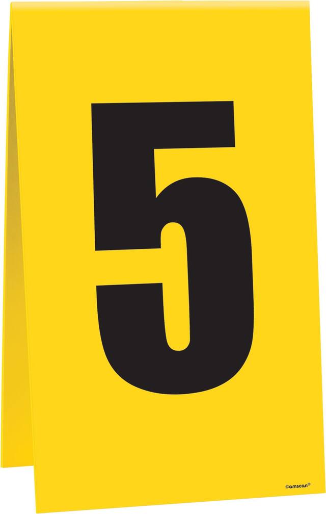 Kit includes five yellow number markers, a cling decal designed to look like blood spatter, chalk, and caution tape