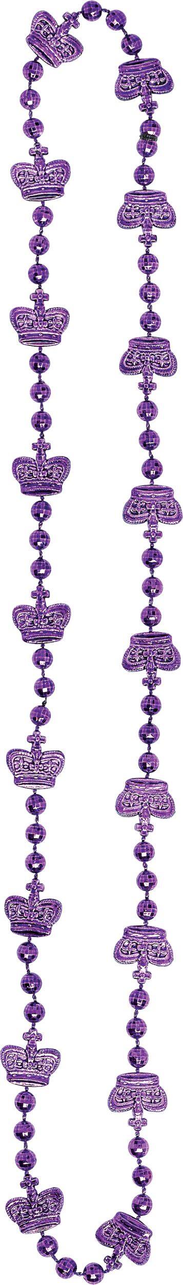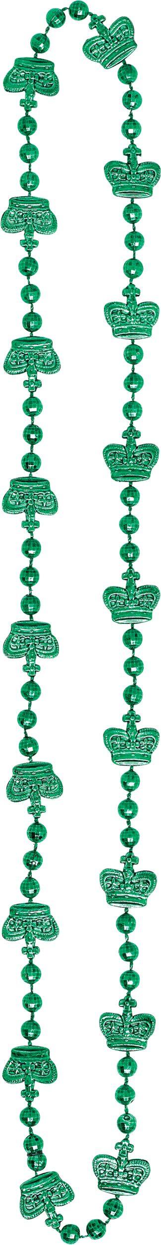 Colourful bead necklaces feature crown and fleur-de-lis designs in shiny green, gold, and purple finishes