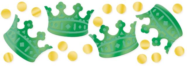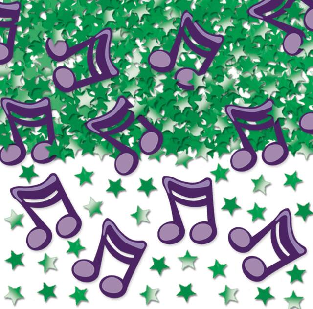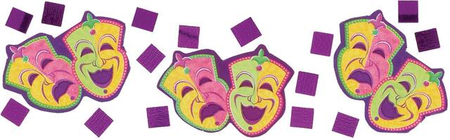 Features three different confetti mixes: purple musical notes with green stars, green crowns with gold doubloons, and comedy-tragedy masks with purple squares