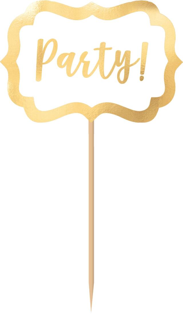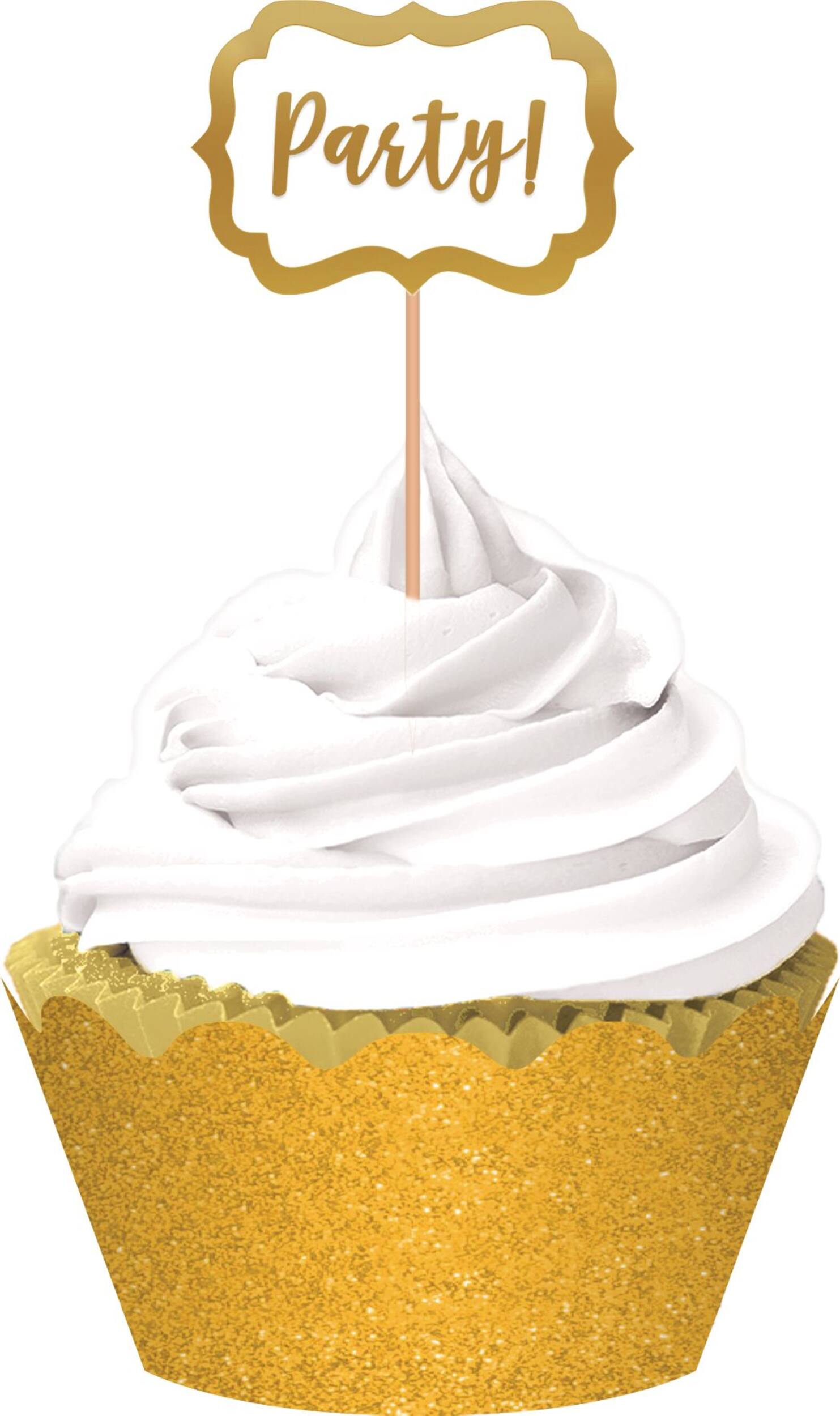 • Includes (24) 2" D baking cups, (24) 3 1/4" H party picks, and (24) 3" D x 1 3/4" H glitter cupcake wrappers