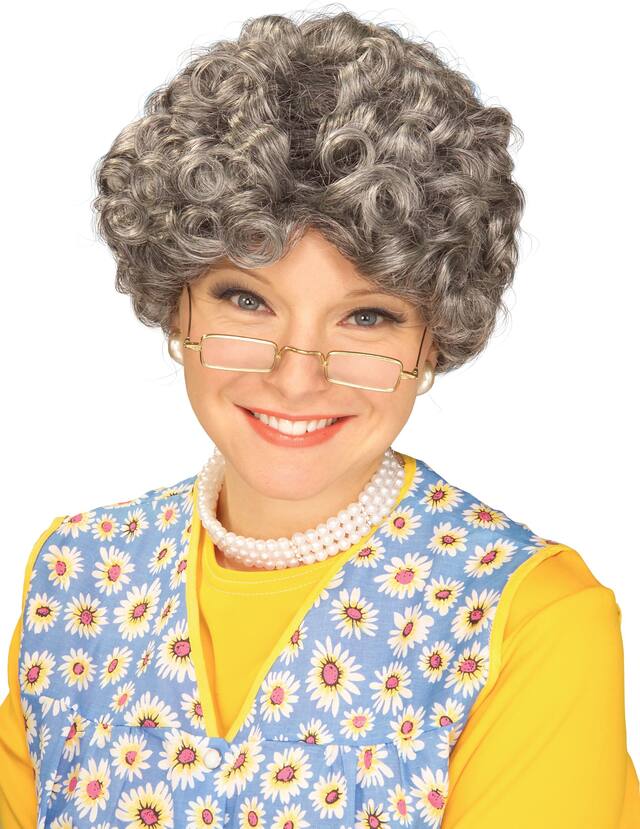 You may be interested in these similar products shown below.Curly Grandma Wig features grey-brown curls styled into a neat bobbed granny perm