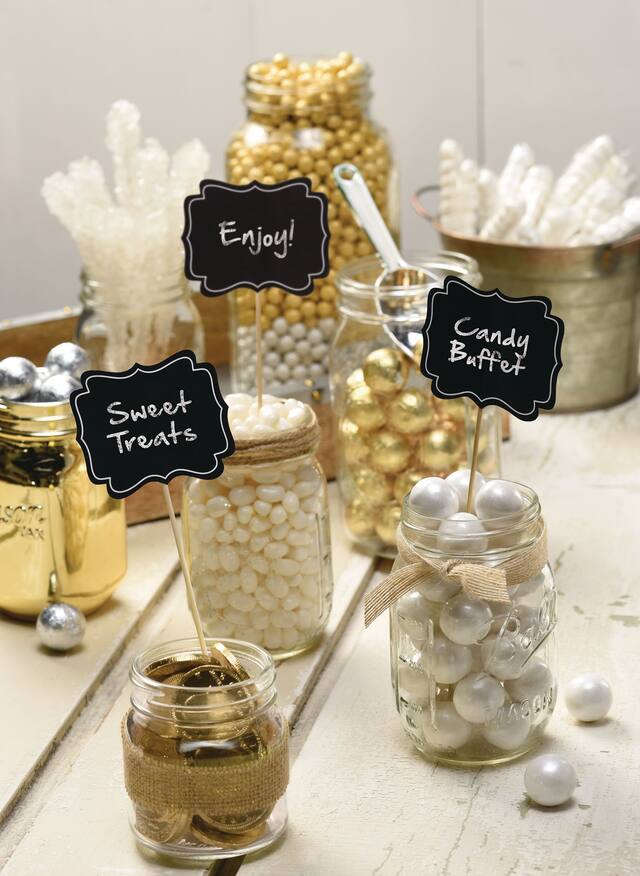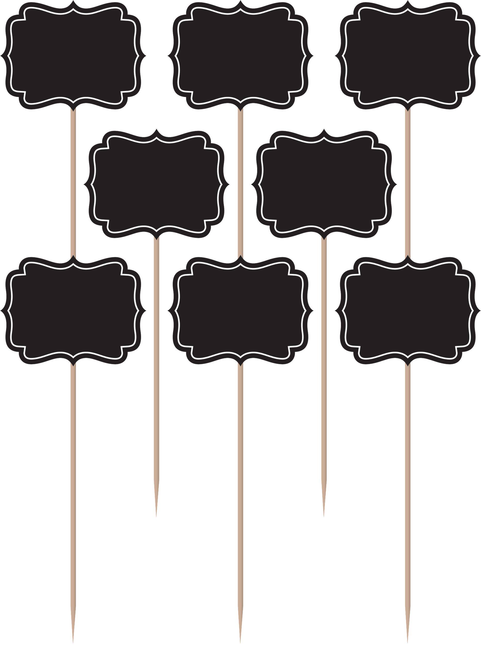 • Large Chalkboard Party Picks feature black cardstock decorated with scrollwork design around the border