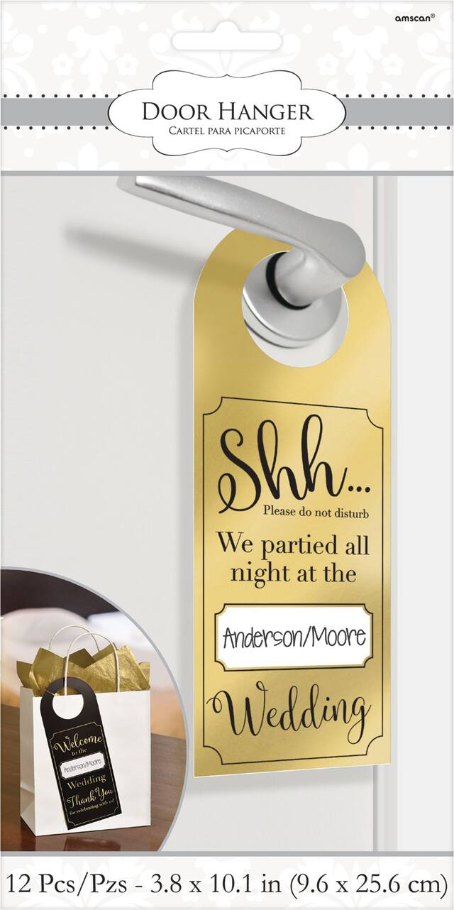 • These door hangers feature a metallic gold background with text asking to not be disturbed and a space to write in the bride and groom's last names on it