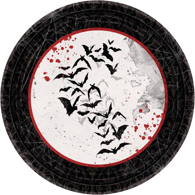 Small Halloween paper plates feature black bats with red blood splatters and a black border with spiderwebs