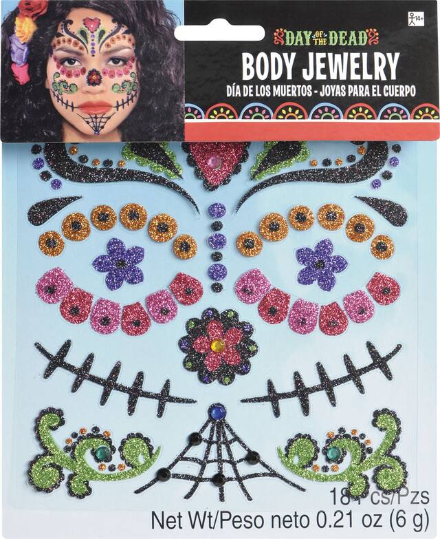 You may be interested in these similar products shown below.Day of the Dead Body Jewelry Pack includes glittery body stickers in heart, flower, and swirly designs that let you create the perfect Dia de los Muertos look for your costume