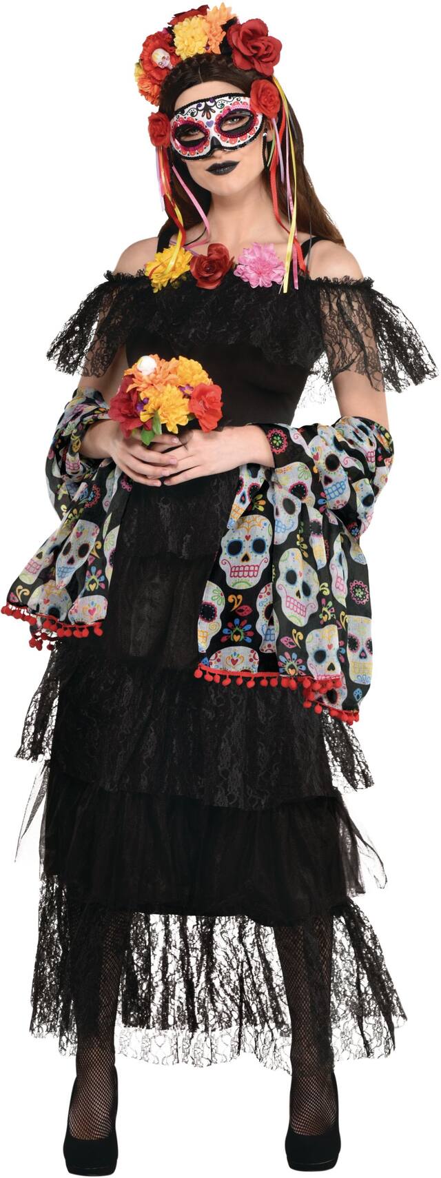 Soft and light, this shawl is a fashionable and comfortable addition to your Dia de Los Muertos costume