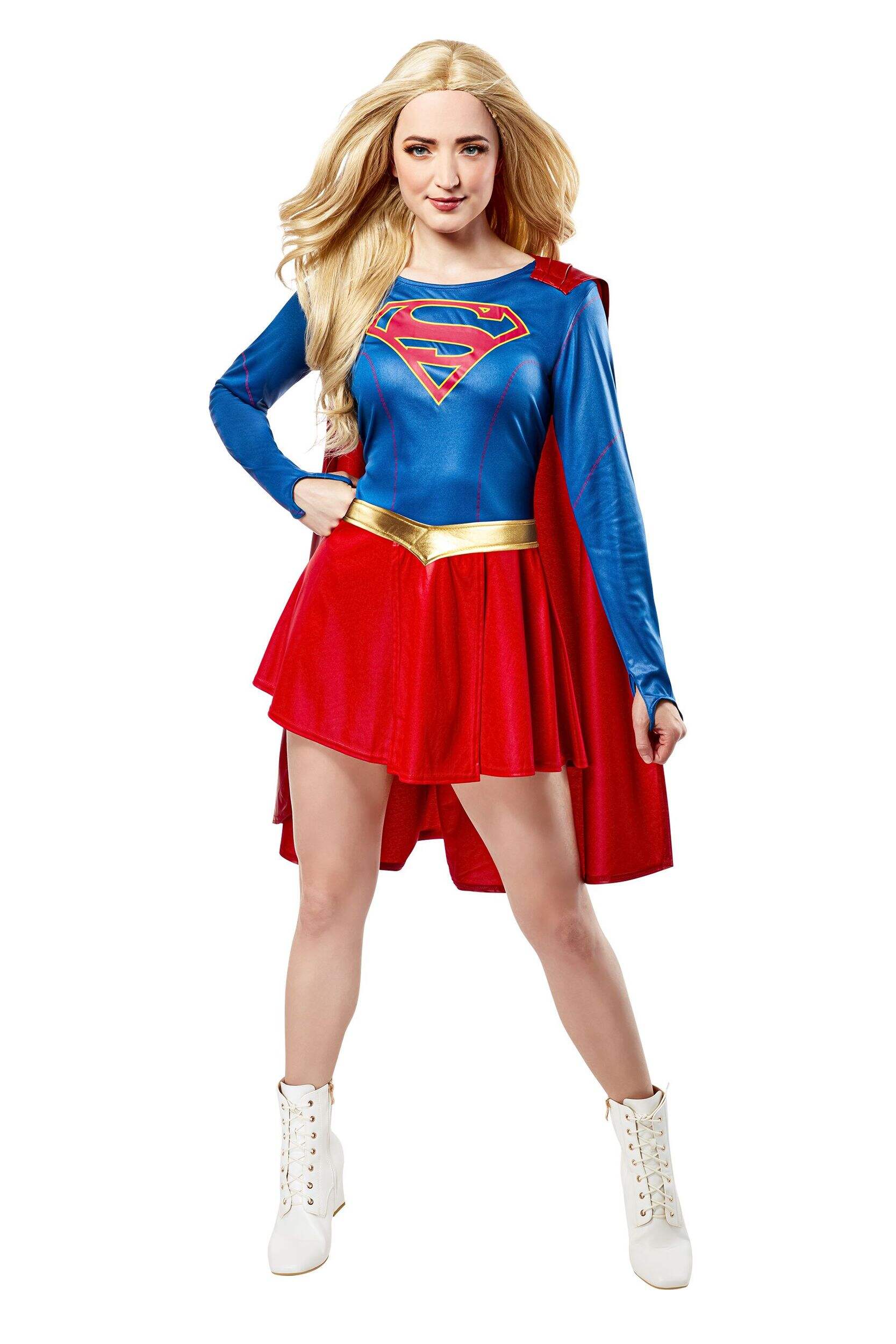 This costume features the classic blue shirt with red skirt of the iconic Supergirl look with a matching cape