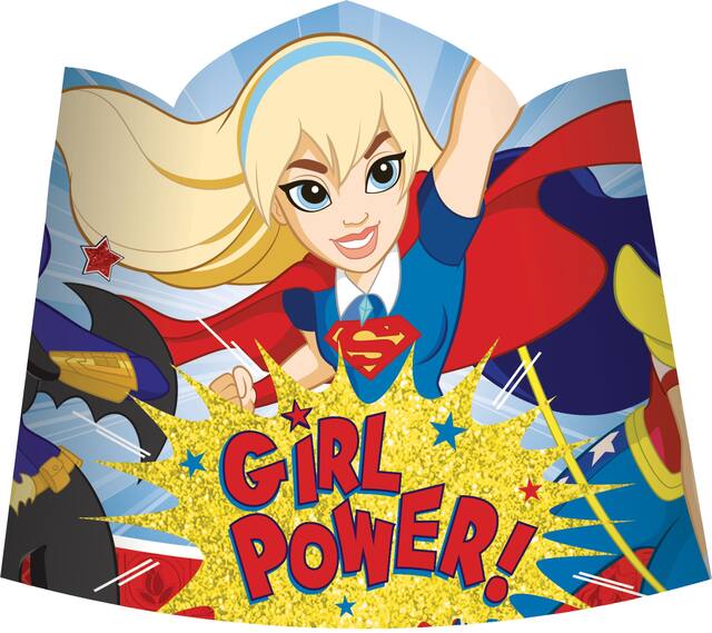 • Cardstock tiaras feature a printed pattern of super hero girls including Wonder Woman, Supergirl, and Batgirl on a blue background with blue and red stars while a yellow burst in the middle reads "Girl Power"
