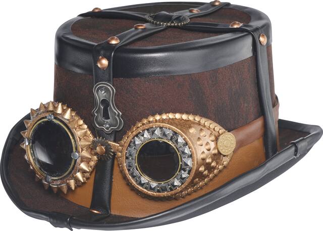 With gold rivets on the top and attached steampunk goggles around the crown, this brown top hat is a fun addition to your steampunk cosplay