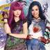 • Large paper napkins feature a colourful print of Mal and Evie against a teal, gold, and purple background