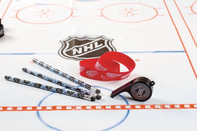 Hockey-themed paper plates feature the team logo on a hockey net background