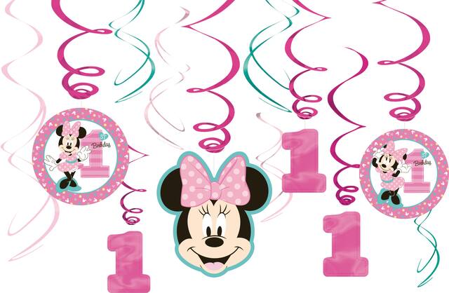 Hanging decorations feature pink and teal swirls with "1" cutouts and double-sided cardstock cutouts of Minnie Mouse with a "1st Birthday" headline