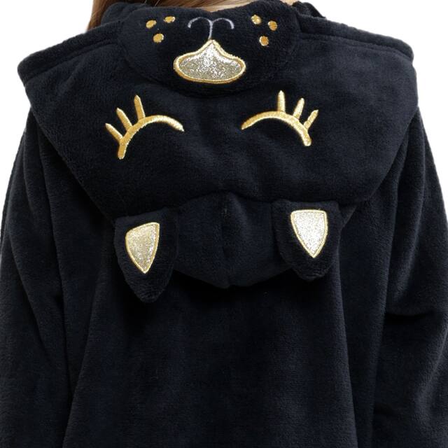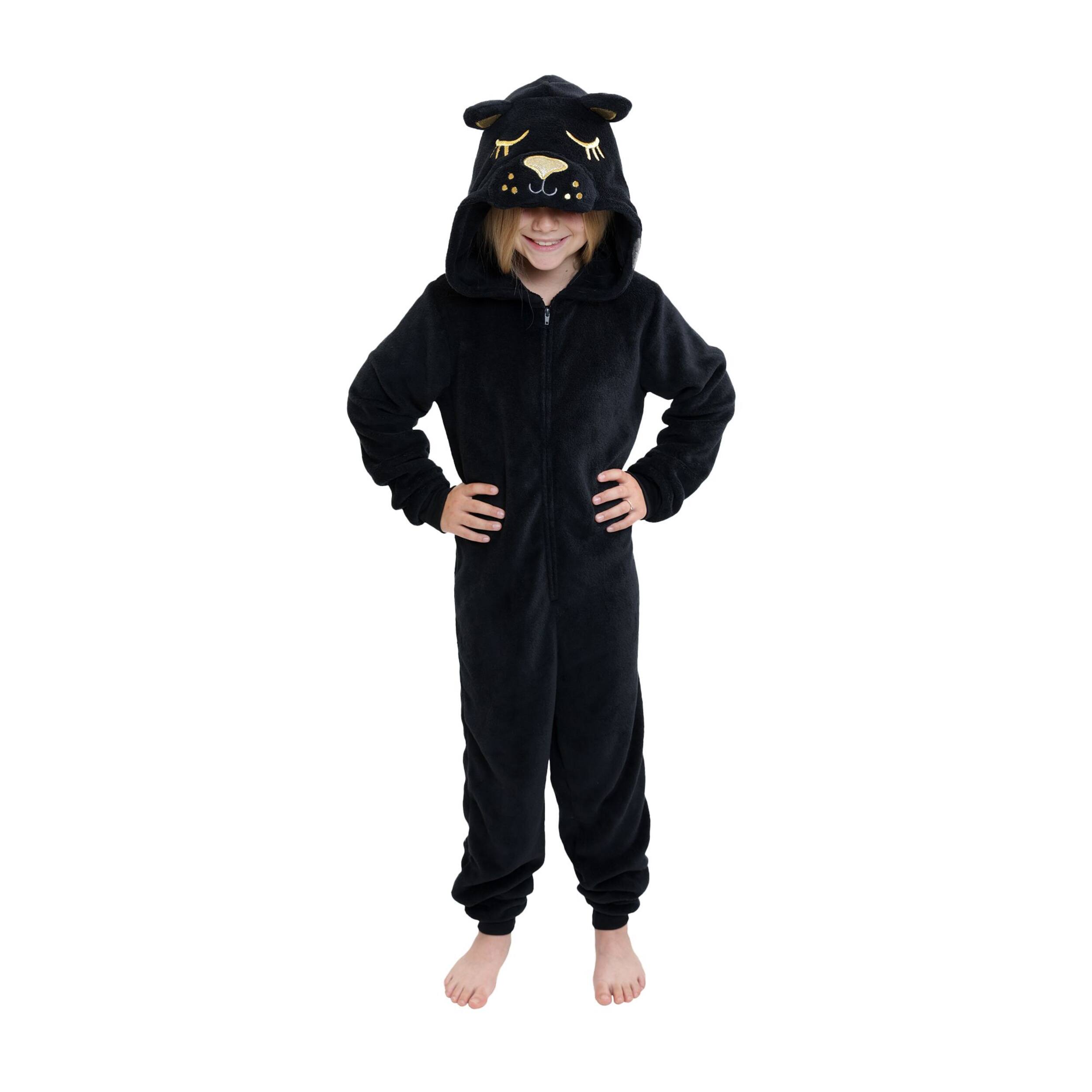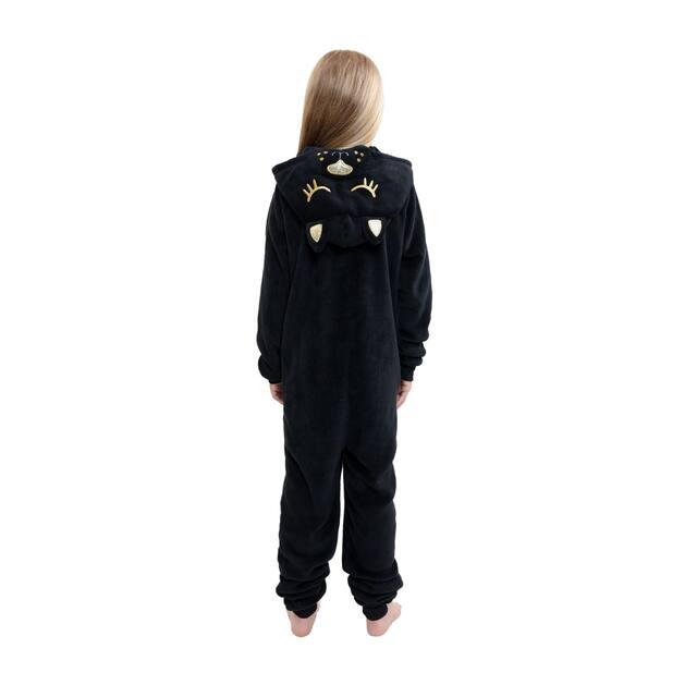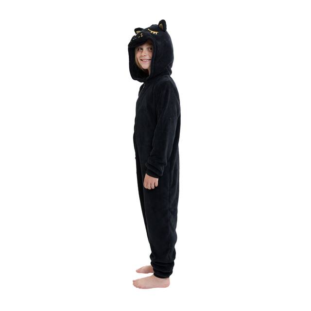 This cozy and warm onesie features a black jumpsuit with a black hood with a cat's face on it