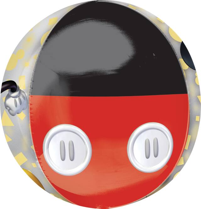 Sphere-shaped balloon features Mickey Mouse on see-through panels and his signature red pants on the other panels