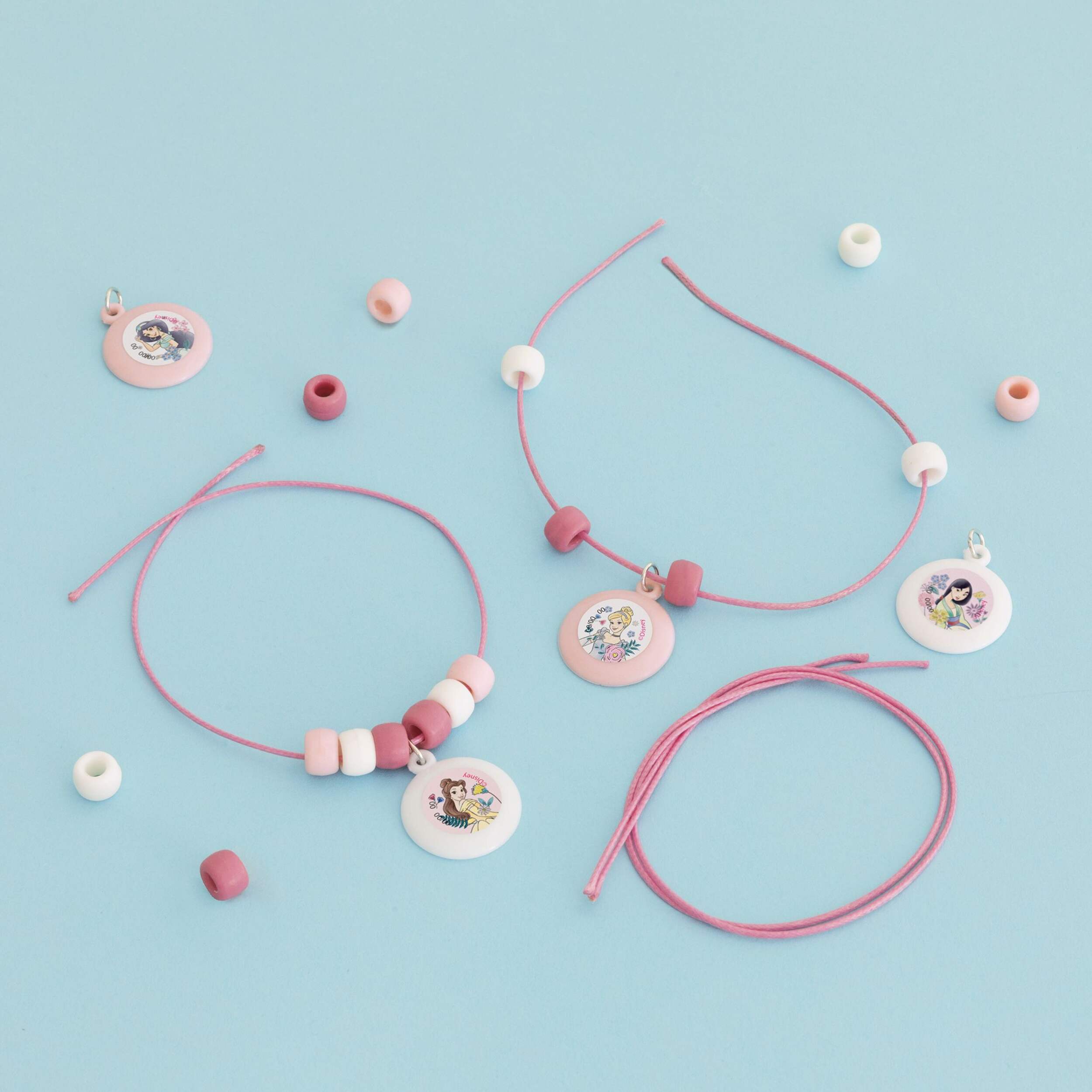 Features charming princess-themed pendants, lovely pink and white beads, and pink thread