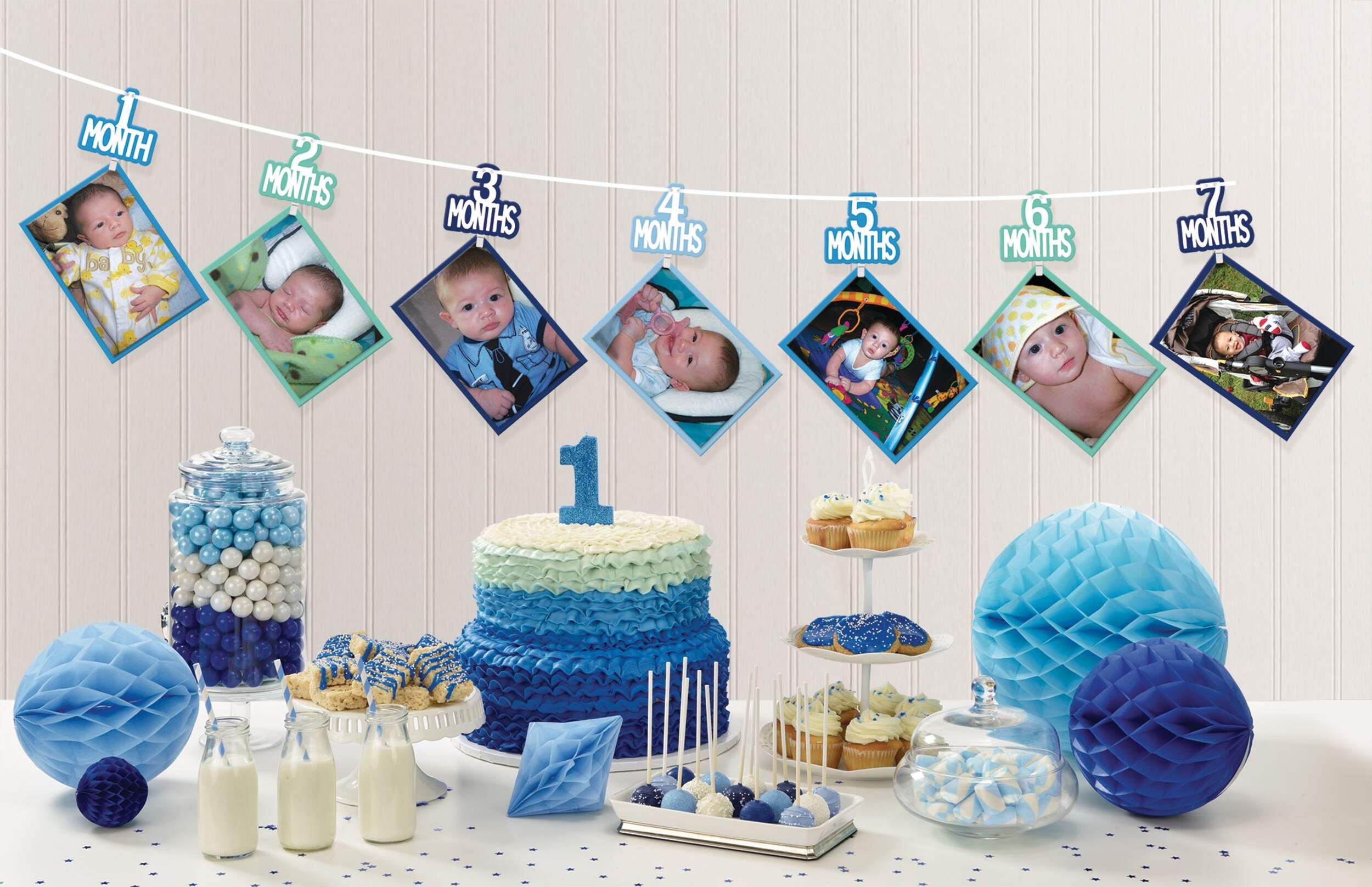 General 1st Birthday Photo Garland features a blue cutout, a clothespin, and a photo mat for each month