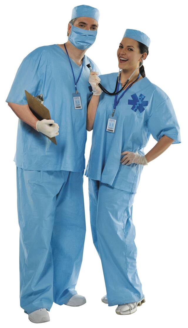 The Adult Doctor Costume from Amscan features a blue scrub shirt that bears an authentic medical emblem, matching the elastic-waist scrub pants for a complete doctor look. Finish off the costume with the included surgical mask, scrub cap, and lanyard ID card. Just add in a stethoscope and you'll be ready to make your rounds at costume parties or Halloween celebrations.
