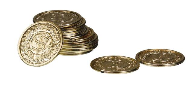 Fill your pirate's chest with 100 of these convincing looking gold coins that feature a dollar sign design. Their toothed rim and pleasingly chunky size at 1.5" (38 mm) make them perfect as party favor trinkets, costume accessories or as props for imaginative play. Kids and adults alike will enjoy rustling up a horde of treasure using this large supply of plastic gold coins.