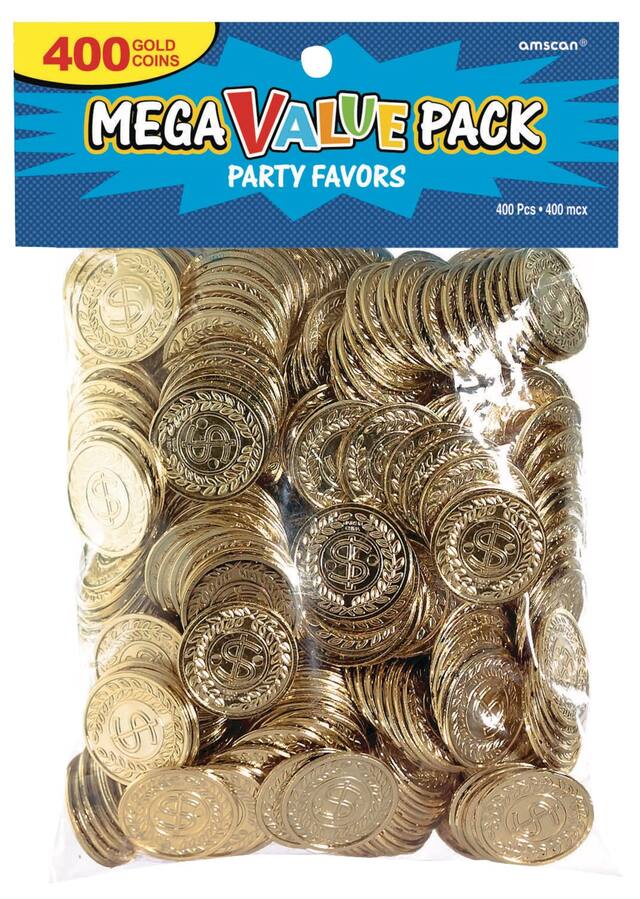 Gold Coins, 400-pk by Amscan are plastic disks meant for theme parties rather than an investment. Stamped with images fit for treasure, these gold-colored coins are perfect for livening up casino night, Mardi Gras celebrations or any pirate-themed bash. Hand these fake coins out as prizes, throws or loot and watch the fun really begin at your event.