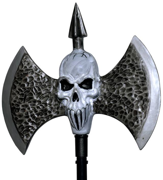 • Moulded plastic double-sided axe features a silver axe head with twin convex blades decorated with medieval flourish inset on either side