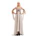 The costume features a beautiful light grey flowy dress and arm cuffs with attached fabric