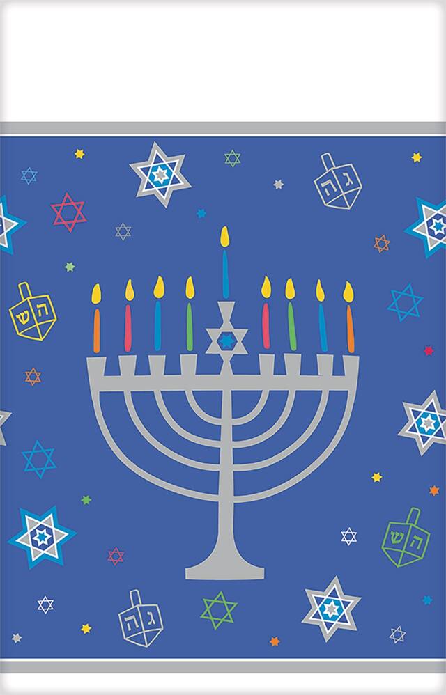 Plastic table cover features borders of menorahs in a row surrounded by dreidels and colourful Stars of David on a blue background