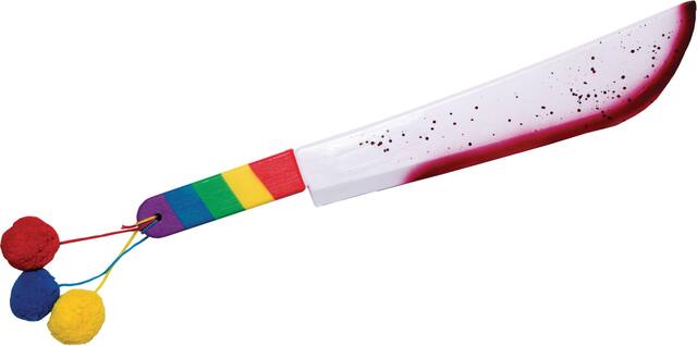 Complete your Halloween clown costume with the Amscan Evil Clown Knife. Sometimes water-spraying daisies and balloon animals just don't cut it! For some real entertainment, you need a clown knife. This sinister-looking Halloween prop is a plastic blood-spattered machete with a silver plastic blade. The multi-coloured handle and pom-poms hearken back to this clown's cheerier days. The Halloween prop clown knife measures 4 x 21 inches.