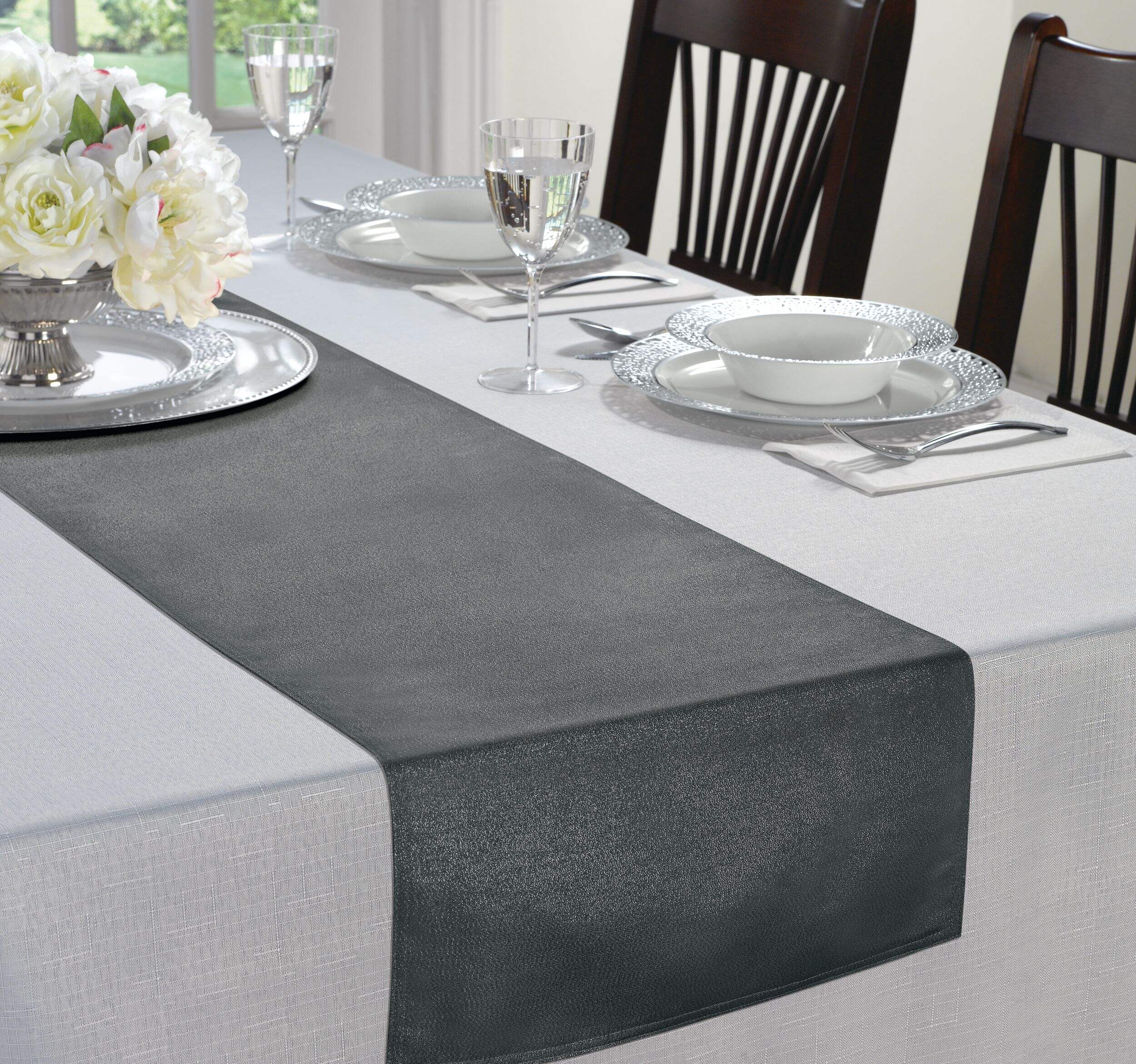 Durable fabric table runner adds a metallic pop of pewter shimmer to your dining table