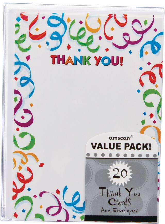 • Fanfare Fun Thank You Cards features a fun confetti border of rainbow swirls and the headline "Thank You!" against a white background