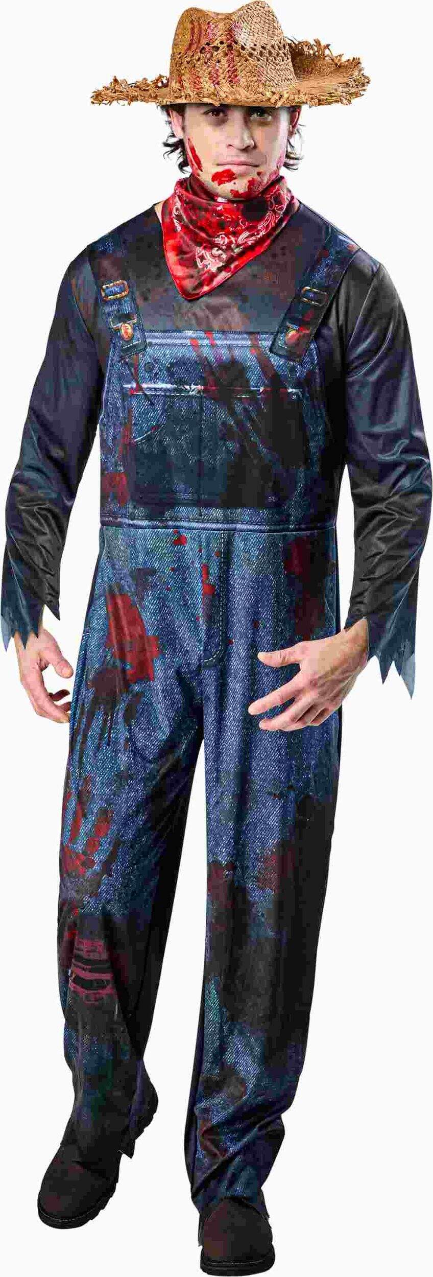 This costume features a bloody blue pair of overalls and shirt with red scarf and straw hat for the perfect terrifying farmer look