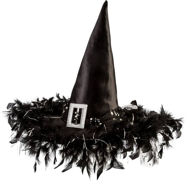 Features a black faux satin narrow cone with a silver buckle accent and black feathers with tinsel covering the edges of the broad brim